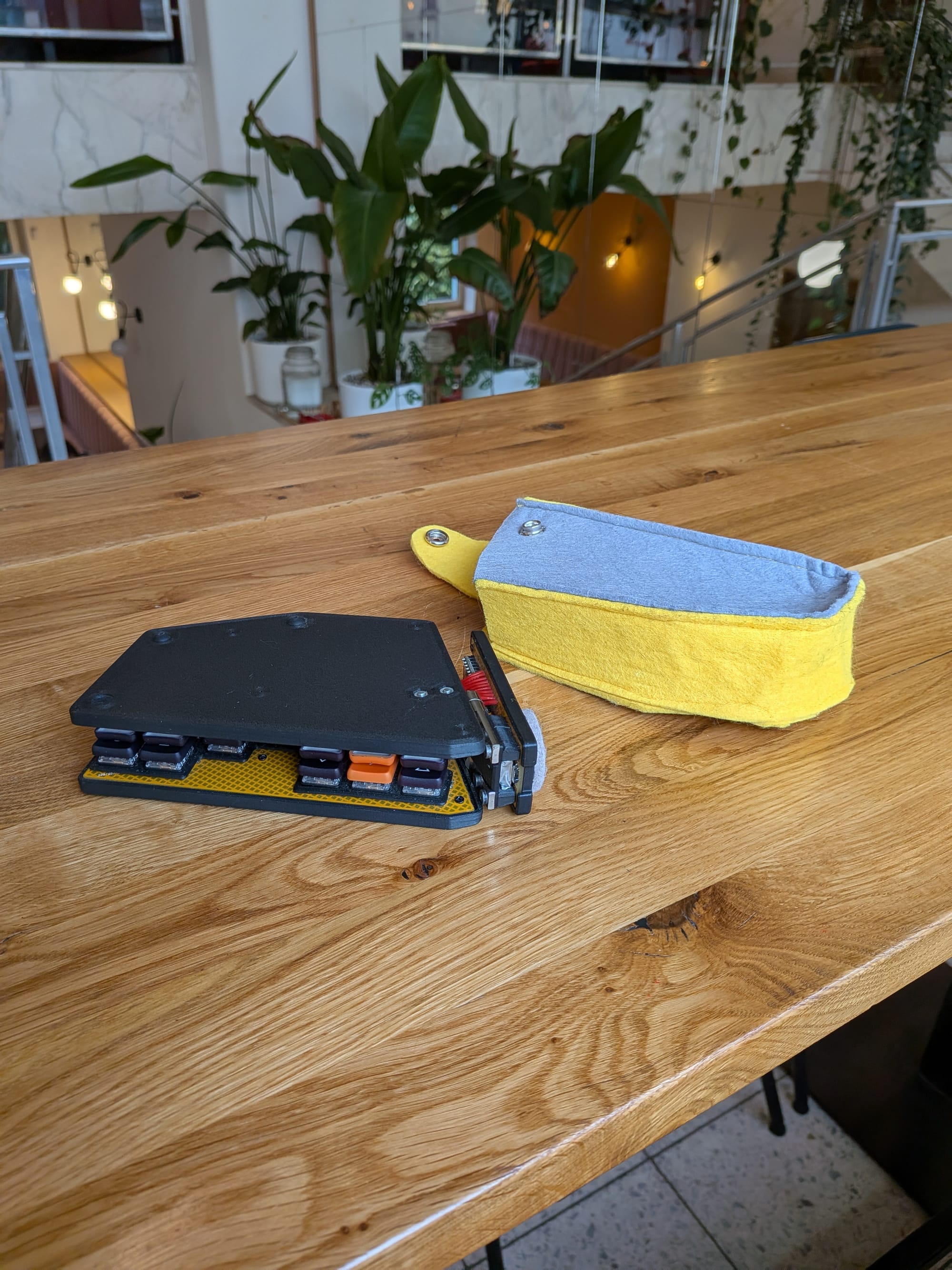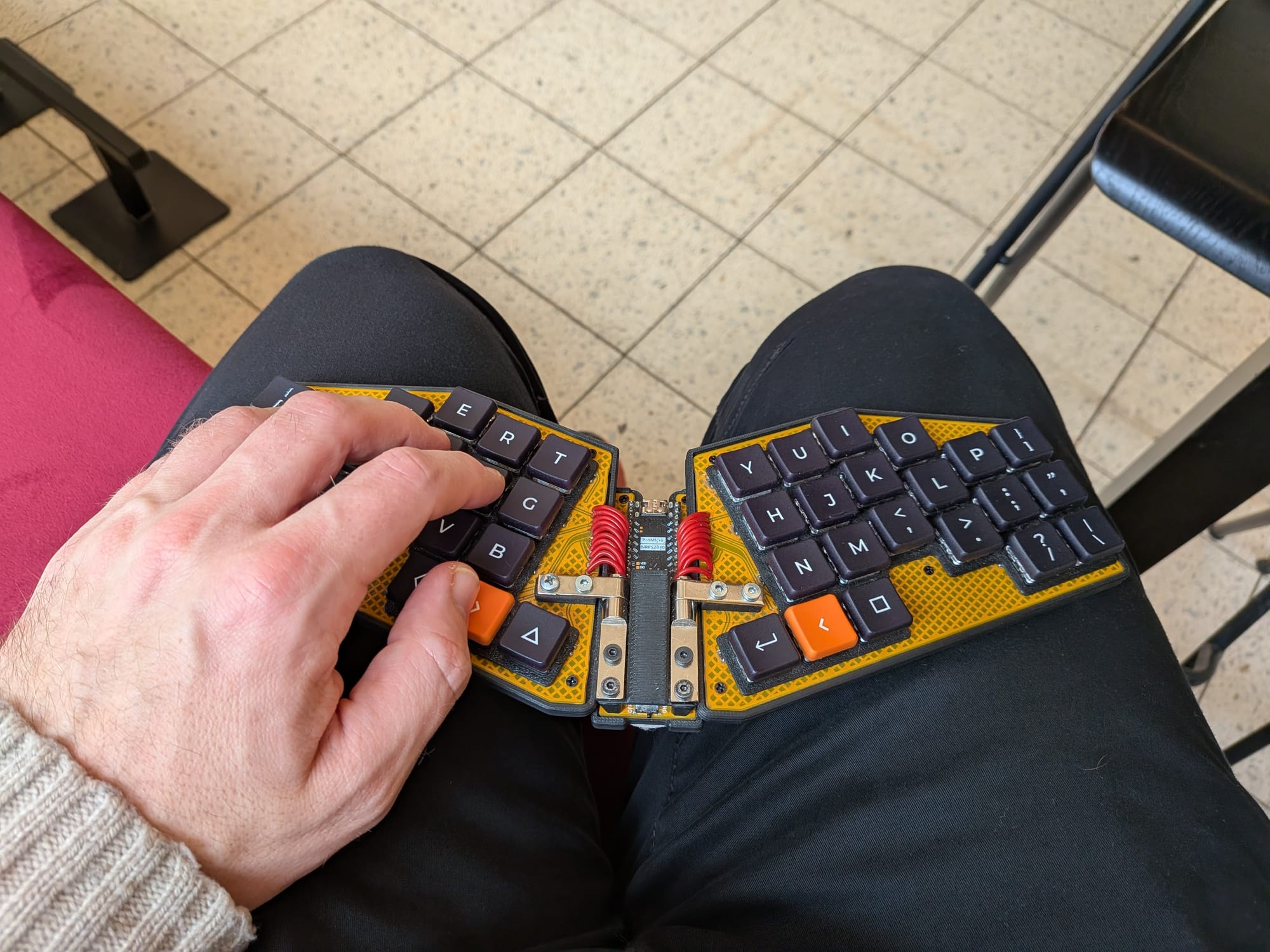 It uses a couple of friction hinges, similar to ones used for laptop lids. I bought them on AliExpress, because I wasn’t able to find anything suitable in local shops. They are quite strong (about 2Nm), and the keyboard can stay in any position; it is even sturdy enough to use on my lap. I am actually typing this note on it while sitting in a coffee shop.
